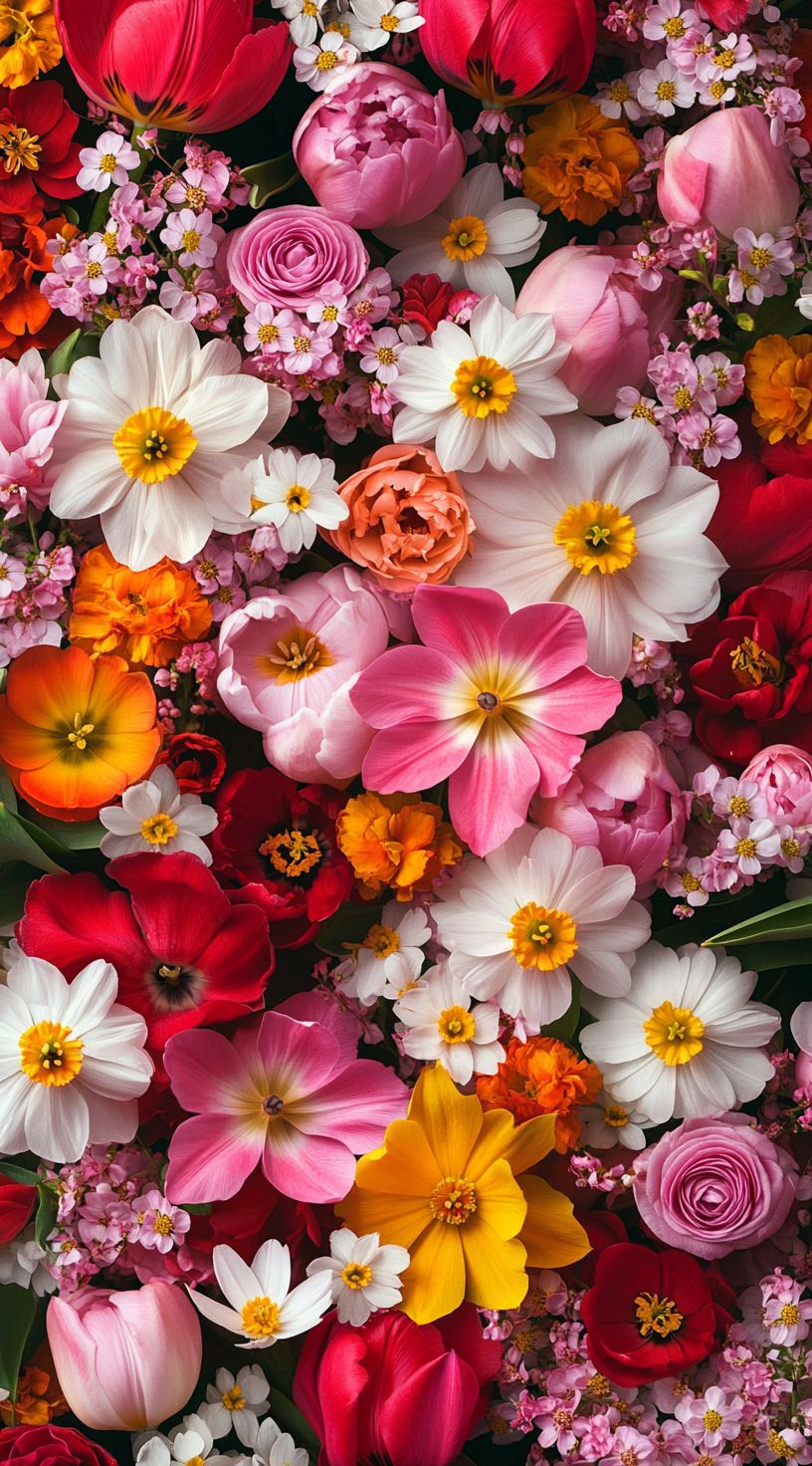Za ljubitelje dramatičnog i luksuznog dizajna, ova tapeta donosi raskošnu eksploziju boja. Gusti mozaik proljećnog cvijeća u nijansama crvene, pink, narandžaste i bijele boje stvara nevjerovatan vizuelni fokus. Savršen je izbor za akcentni zid u spavaćoj sobi ili hodniku, dajući prostoru teksturu i bezvremensku eleganciju.