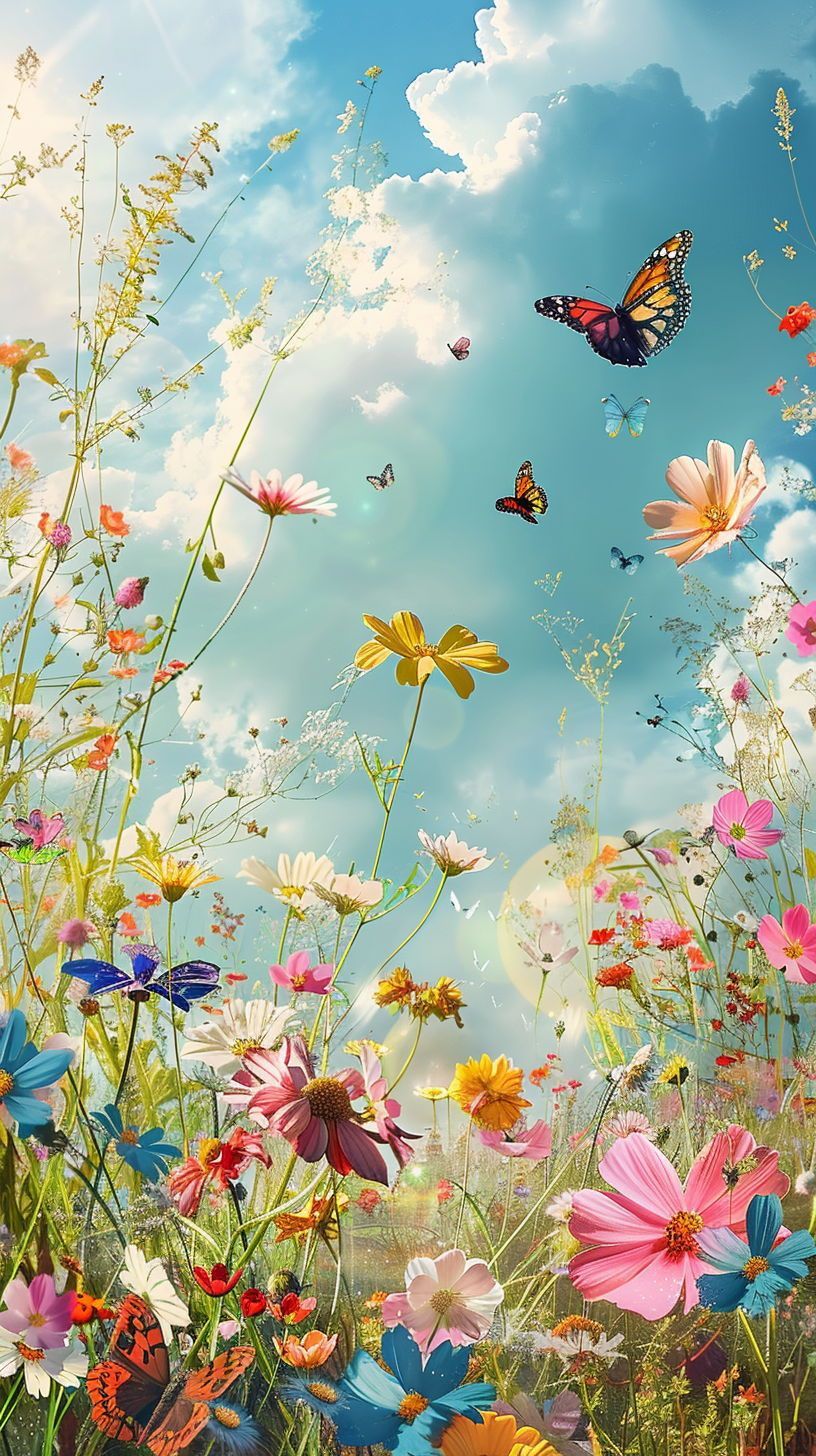 Pretvorite zid u scenu iz bajke. Ova kreativna foto tapeta prikazuje visoko poljsko cvijeće koje se izdiže ka plavom nebu, dok oko njega lepršaju raznobojni leptiri. Dinamičan dizajn pun života savršen je za dječije sobe ili prostore za igru, podstičući maštu i unoseći radost prirode u enterijer.