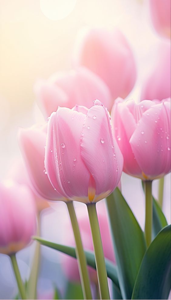 Doživite ljepotu detalja uz ovaj makro prikaz nježno ružičastih tulipana. Kapi rose na laticama i meki fokus (bokeh) u pozadini daju ovoj tapeti izuzetnu dubinu i svježinu. Ovaj motiv unosi sofisticiranost i eleganciju u trpezarije ili radne prostore, stvarajući ambijent koji odiše čistoćom i novim početkom.