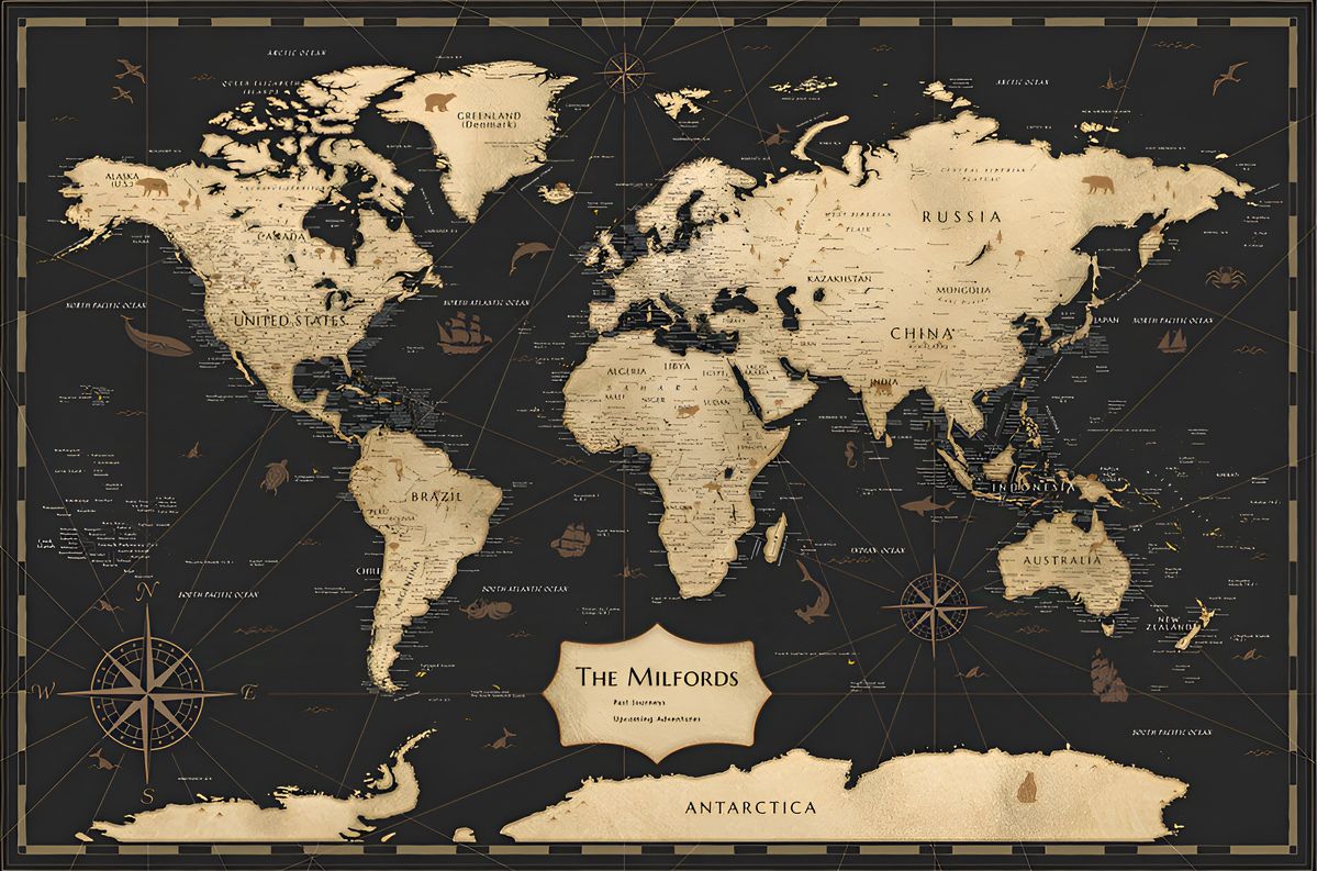 Za ljubitelje luksuza i modernog minimalizma, ovaj dizajn nudi savršen kontrast. Na tamnoj, mat crnoj pozadini ističu se kontinenti u toploj boji zlata sa preciznim natpisima država i okeana. Idealna je za naglašavanje zida u modernim dnevnim boravcima ili prestižnim kancelarijama. Sofisticiran dizajn koji prostoru daje dubinu i ekskluzivan karakter.